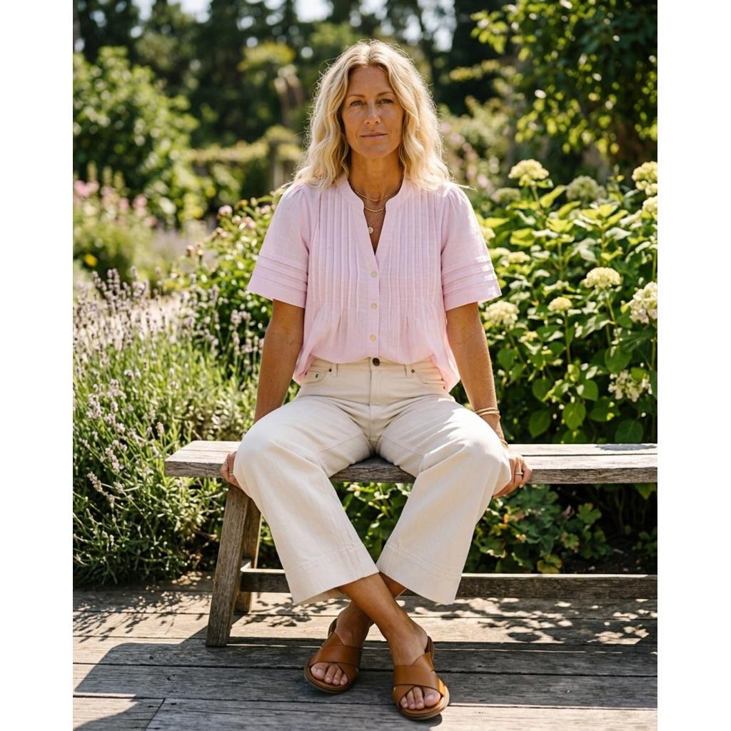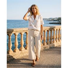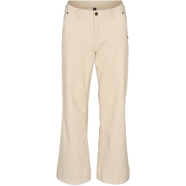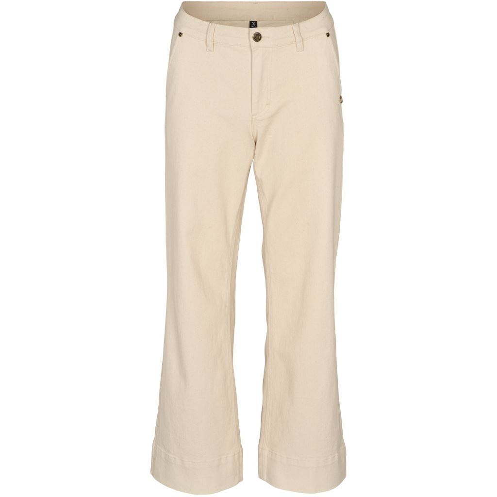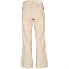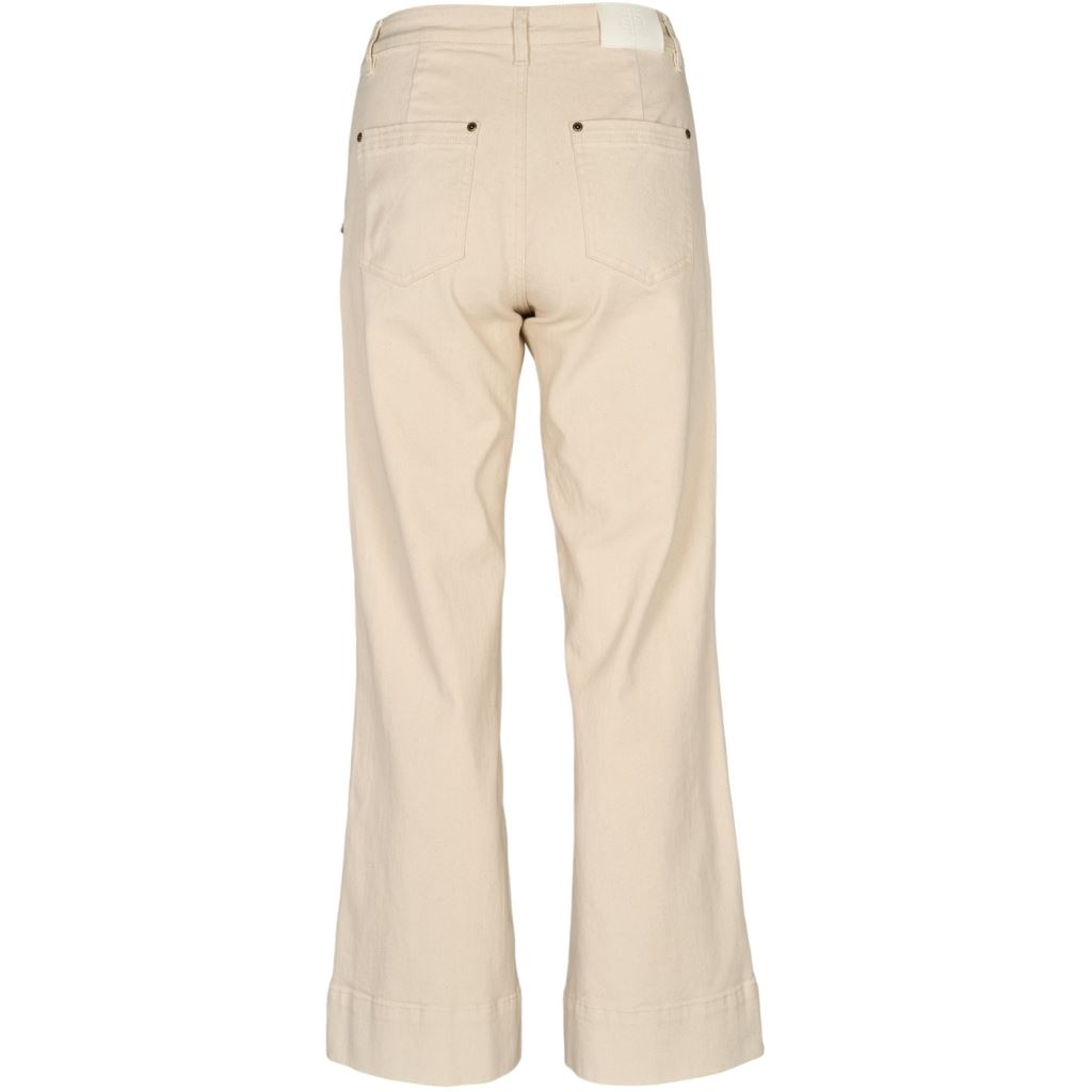 Malia Jeans er en super lækker jeans i en fin Off White farve med vidde. Bukserne har mellemhøj talje og fast linning med bæltestropper, to sidelommer samt to baglommer. Benene afsluttes med en bred, påsyet kant forneden, som giver et markant og struktureret udtryk. Bukserne er med lynlås og en enkelt knap og er i en blød og lækker kvalitet.