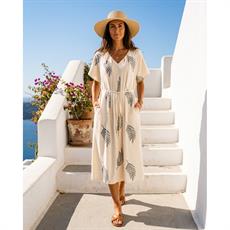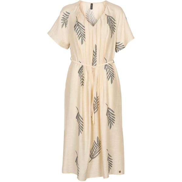 Maria Dress er en fin midi kjole i lys beige med gennemgående bladprint i kontrastfarve. Modellen har V-udskæring og korte ærmer og lommer i sidesømmen samt en løs og let pasform. Kjolen har et aftageligt bindebælte i taljen, som giver mulighed for at justere silhuetten.