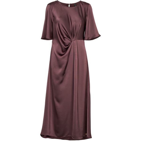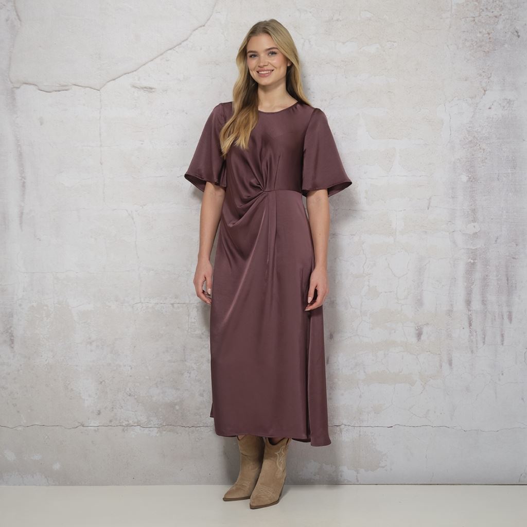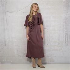 Elegant, figursyet kjole i et smukt, blødt faldende materiale. Kjolen har rund halsudskæring og korte, løstsiddende ærmer med let vidde. Den dekorative drapering i taljen fremhæver figuren og giver et feminint udtryk. Modellen har en let A-formet silhuet og falder flot til midt på læggen.