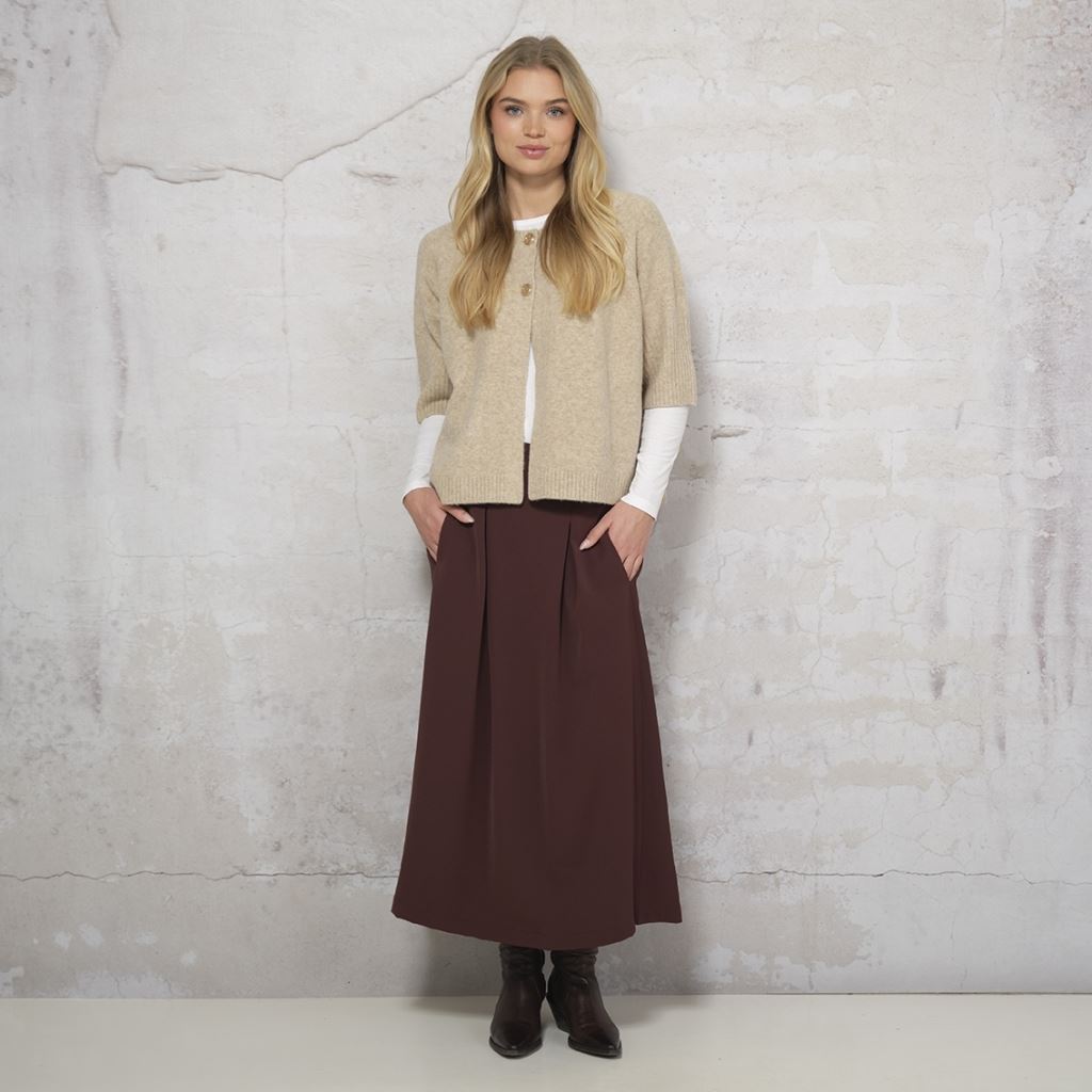 Pauline Skirt er en midi-nederdel i den fineste bordeaux farve. Nederdelen har brede læg foran, bred linning og diskret lynlås bagpå. Nederdelen har skrålommer i siden.