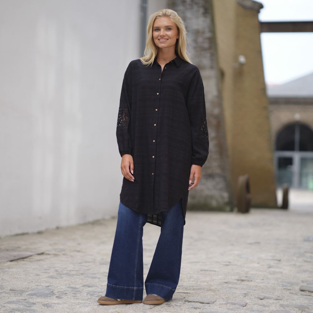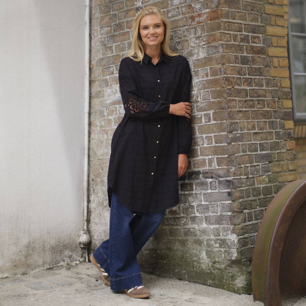 Celia Dress er en skøn skjortekjole i let transparent og stribet stof. Kjolen har et enkel og klassisk snit med skjortekrave og lange ærmer. Den har lange ærmer med elastiske manchetter. Kjolen er gennemknappet med fine guldknapper og dekorativt hul broderet mønster på ærmerne.