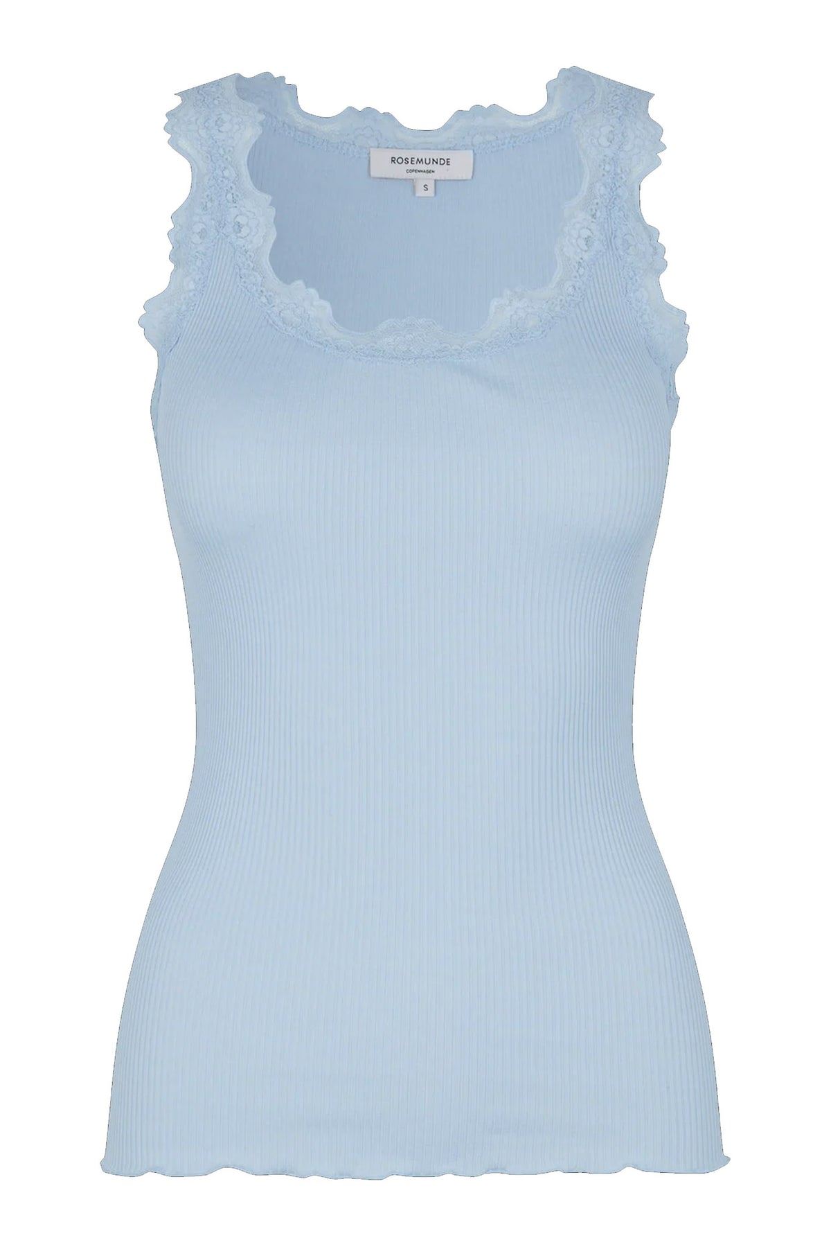 Rosemundes ikoniske silketop er designet med en fin blondekant omkring den runde halsudskæring, og har en fin krølkant forneden, som fuldender det feminine udtryk. Toppen er rundstrikket i en blød ribbet silkekvalitet uden syninger i siden, hvilket gør den utrolig behagelig at have på. Vores silketop findes i tre længder: kort, regular og lang.