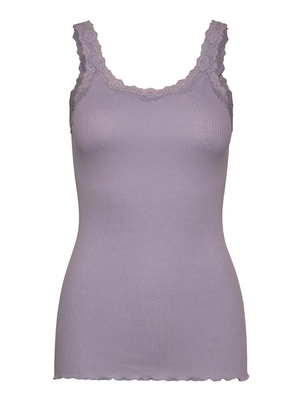Rosemundes ikoniske silketop er designet med en fin blondekant omkring den runde halsudskæring, og har en fin krølkant forneden, som fuldender det feminine udtryk. Toppen er rundstrikket i en blød ribbet silkekvalitet uden syninger i siden, hvilket gør den utrolig behagelig at have på. Vores silketop findes i tre længder: kort, regular og lang.