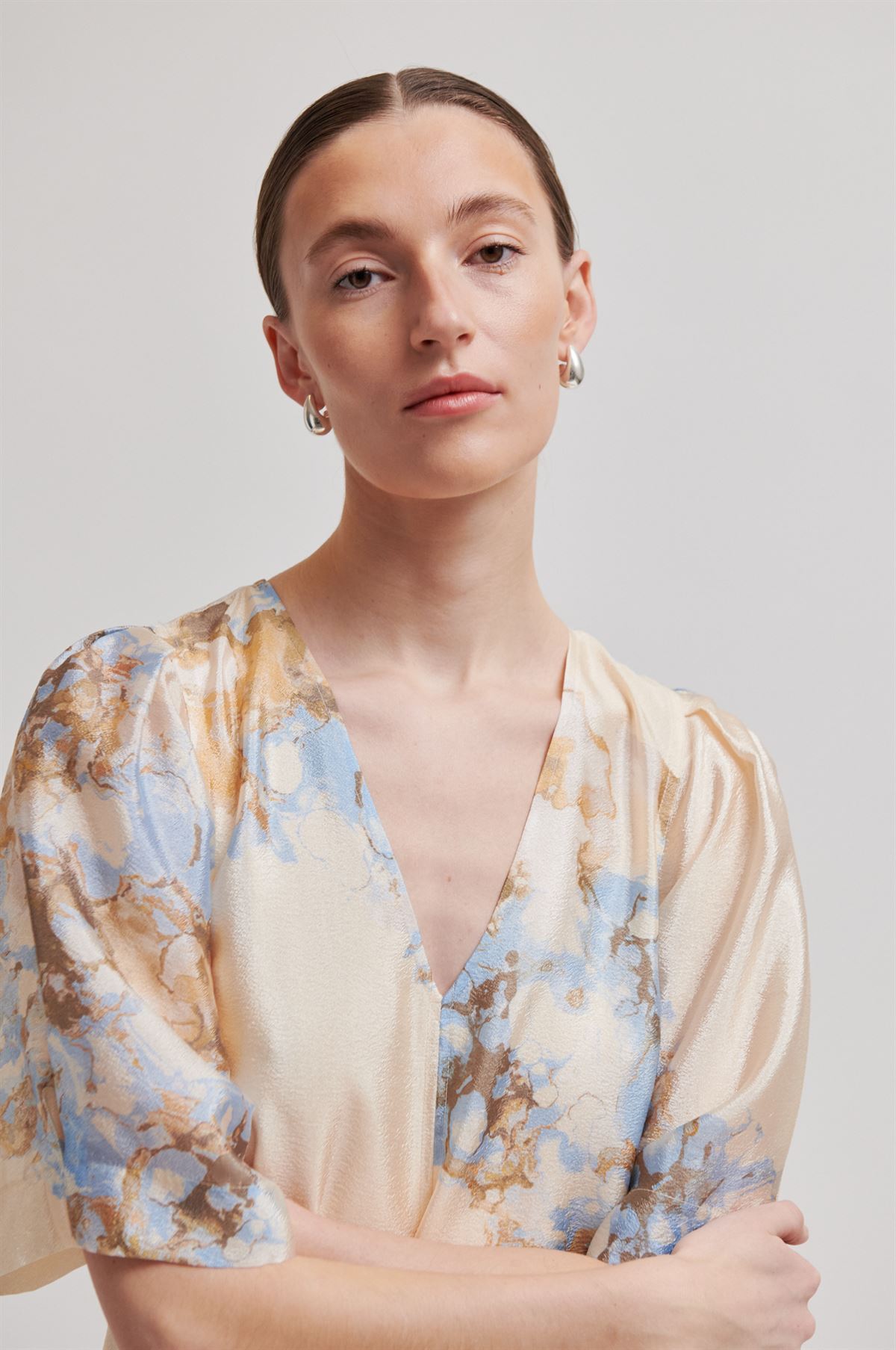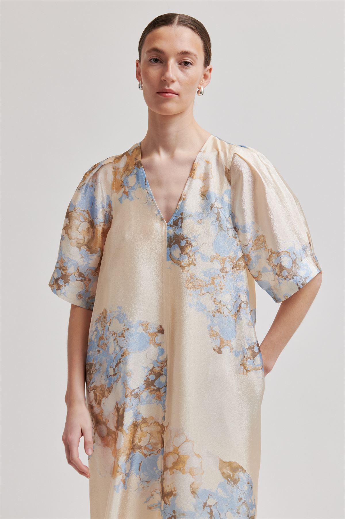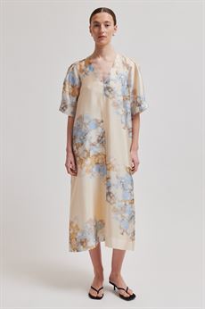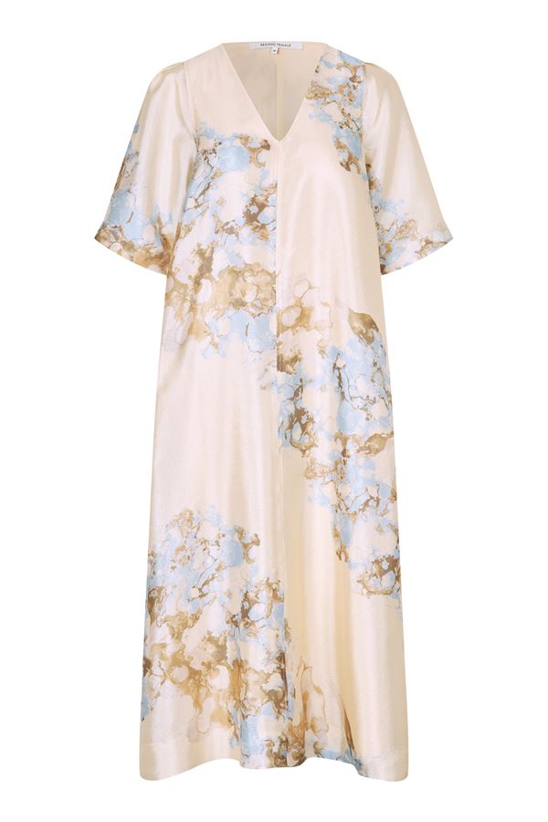 Second Female maxikjole med mønster. Kjolen er fremstillet i en let genanvendt polyesterblanding med gennemgående mønster og skinnende finish. Med V-udskæring, korte ærmer og skjulte lommer i sidesømmene. Høje slidser i siderne. Foret til knæet. Lang og lige pasform.