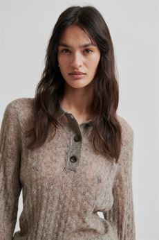 Second Female pullover med krave. Pulloveren er fremstillet i en ultrablød yakblanding i fin, semitransparent strik. Med ribbet krave og halv stolpelukning med knapper foran. Lave skuldre med lange ærmer. Ribstrikkede manchetter og kant forneden. Tætsiddende pasform.