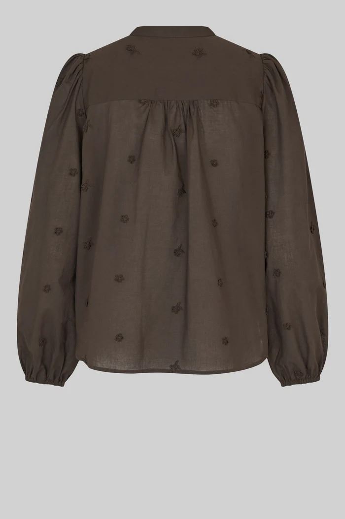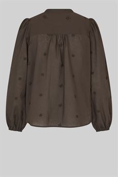 Second Female skjorte med 3D-detaljer. Skjorten er fremstillet i blød bomuld med gennemgående 3D-broderi. Med rund krave og gennemgående knaplukning. Rynker ved skuldre og elastiske manchetter, der skaber en pufeffekt. Normal pasform.