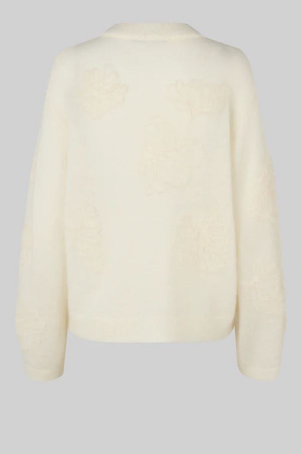 Second Female pullover med 3D-blomster. Pulloveren er fremstillet i en blød og elastisk mohairblanding med 3D-netblomster. Rund halsudskæring og lave skuldre med lange vide ærmer. Ribkant ved hals, manchetter og forneden. Afslappet pasform.