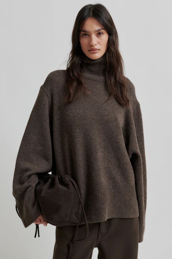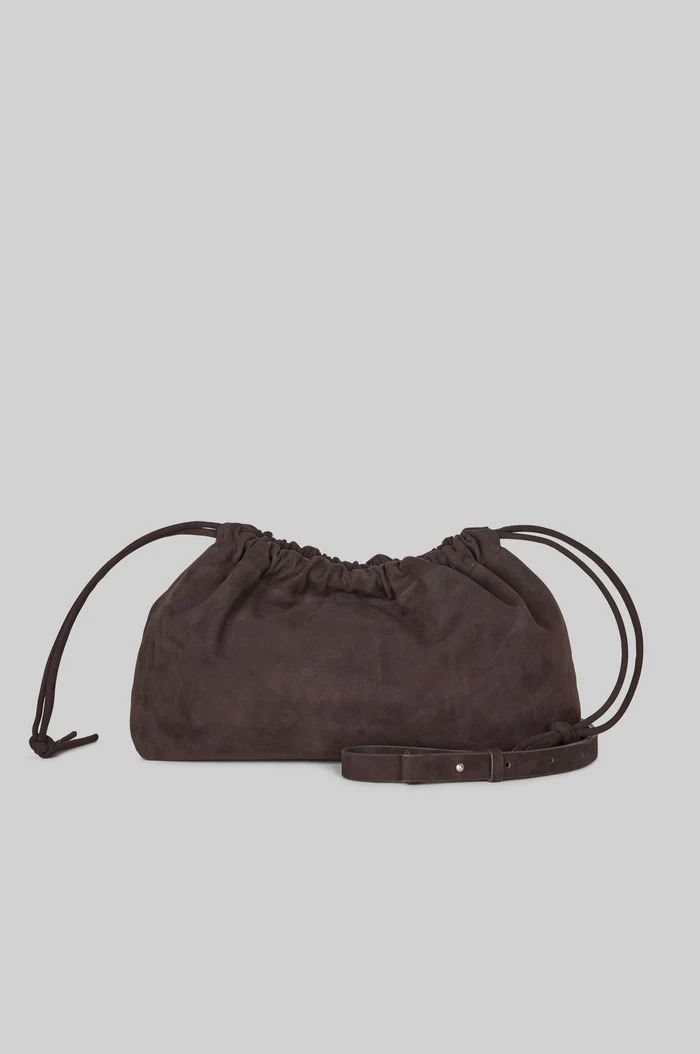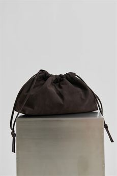 Second Female ruskindstaske med snøre. Toppen er fremstillet i blødt og glat gederuskind. Med magnetlukning og snøre i toppen og bindebånd med knuder i begge sider. Indvendig lynlåslomme.