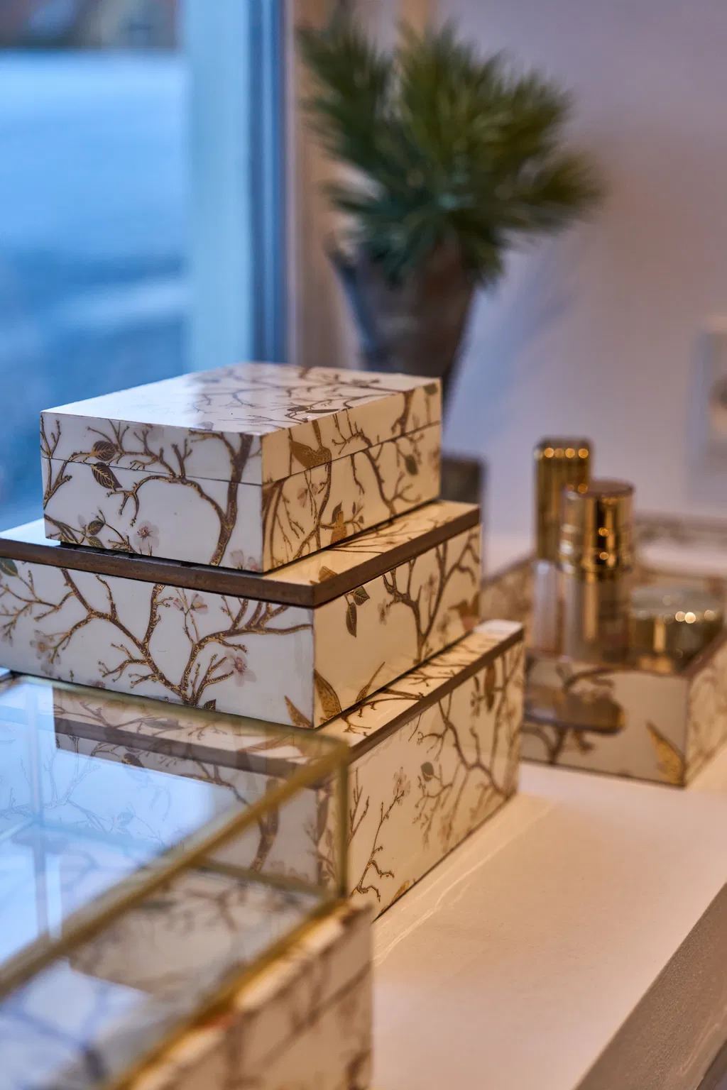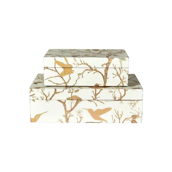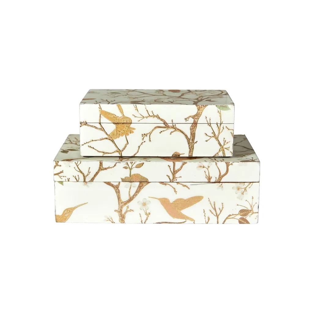 Æskesæt i MDF med smukt mønster i hvid/guld med grene og fugle. Perfekt opbevaring af nips, nøgler, smukker eller andet.