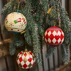 Håndmalet juleornament i flotte farver og mønstre. Kan både bruges til at hænge på en gren eller som dekoration på et fad.
