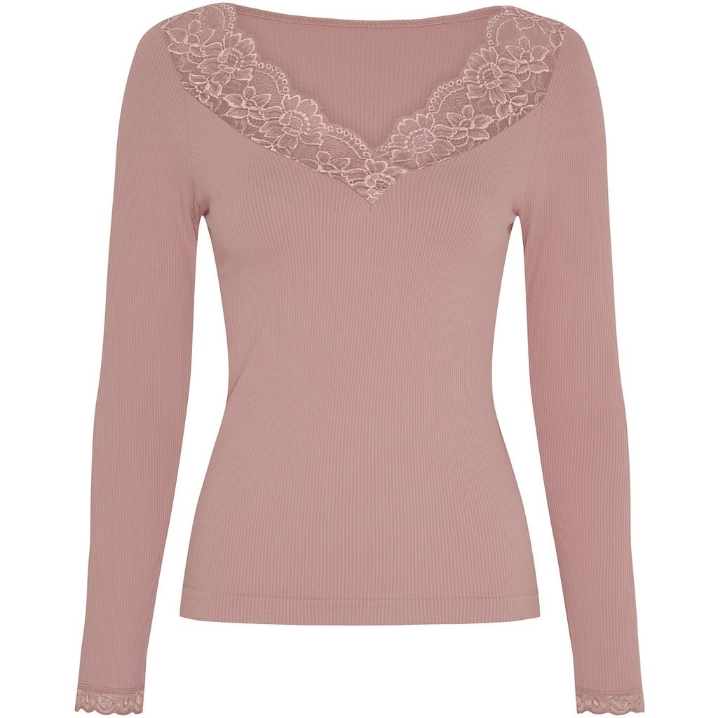 Rib bluse med blondekanter ved halsen og ærmerne.