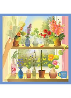 Vindueskarmen er fuld af liv, med blomster og grønne planter der står tæt side om side. Små stiklinger vidner om en passion for at give nyt liv og få noget til at gro.Solens stråler skinner ind gennem ruden. Den får farverne til at lyse og bladene til at stråle, mens duften af friske blomster breder sig i rummet.
