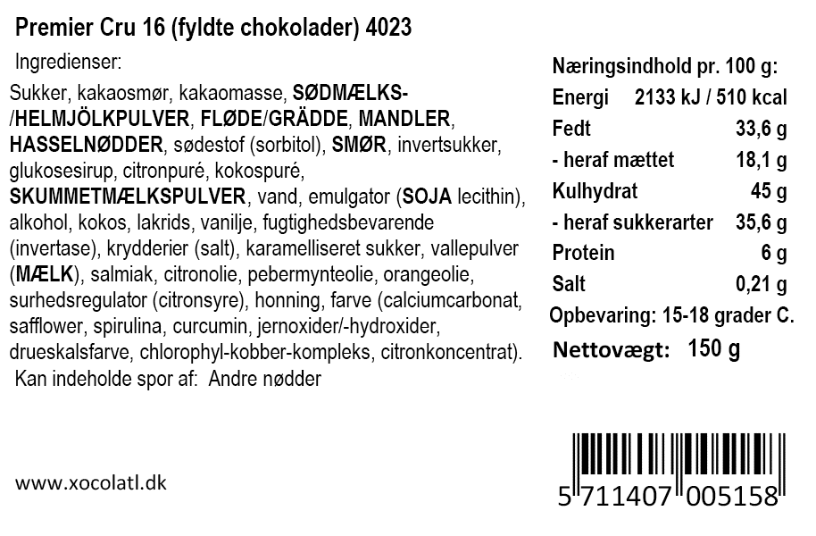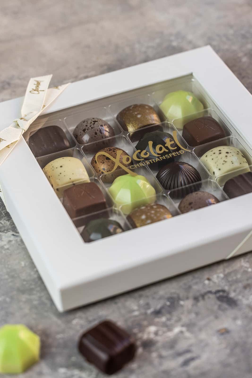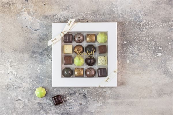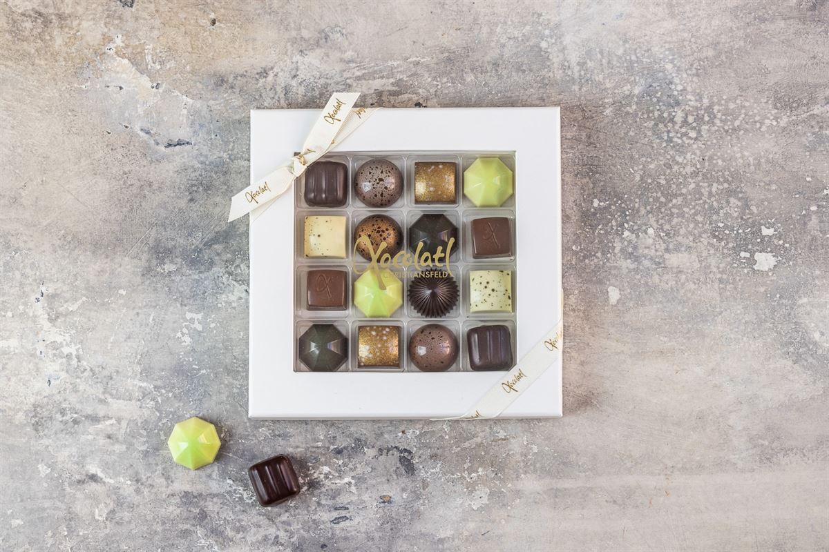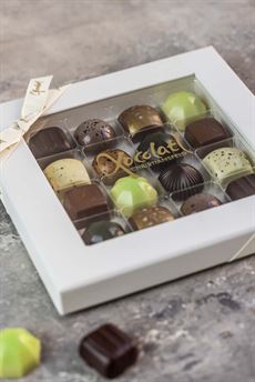 I denne smukke æske er der 16 stykker fyldte velsmagende chokolader med smag af mint, lakrids, saltkaramel, rom, orange, hasselnød,70% mørk ganache, flødekaramel og marcipan med mørk chokolade