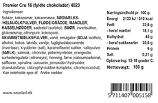 Ingredienser (DK/SE): sukker, kakaomasse, FLØDE/GRÄDDE, kakaosmør, SØDMÆLKS- /HELMJÖLKPULVER, glukose, sødestof (sorbitol), SMØR/SMÖR, HASSELNØDDER/-NÖTTER, invertsukker, SKUMMETMÆLKS- /LÄTTMJÖLKPULVER, isomalt, invertsukker, vallepulver (MÆLK/MJÖLK), lakrids, salt, karamelliseret sukker, emulgator (SOJA lecithin), vanilje, salmiak, honning, orangeolie, pebermynteolie, azo-fri farve (titandioxid, curcumin, chlorophyl-kobber-kompleks, jernoxider/- hydroxider, anthocyanin)